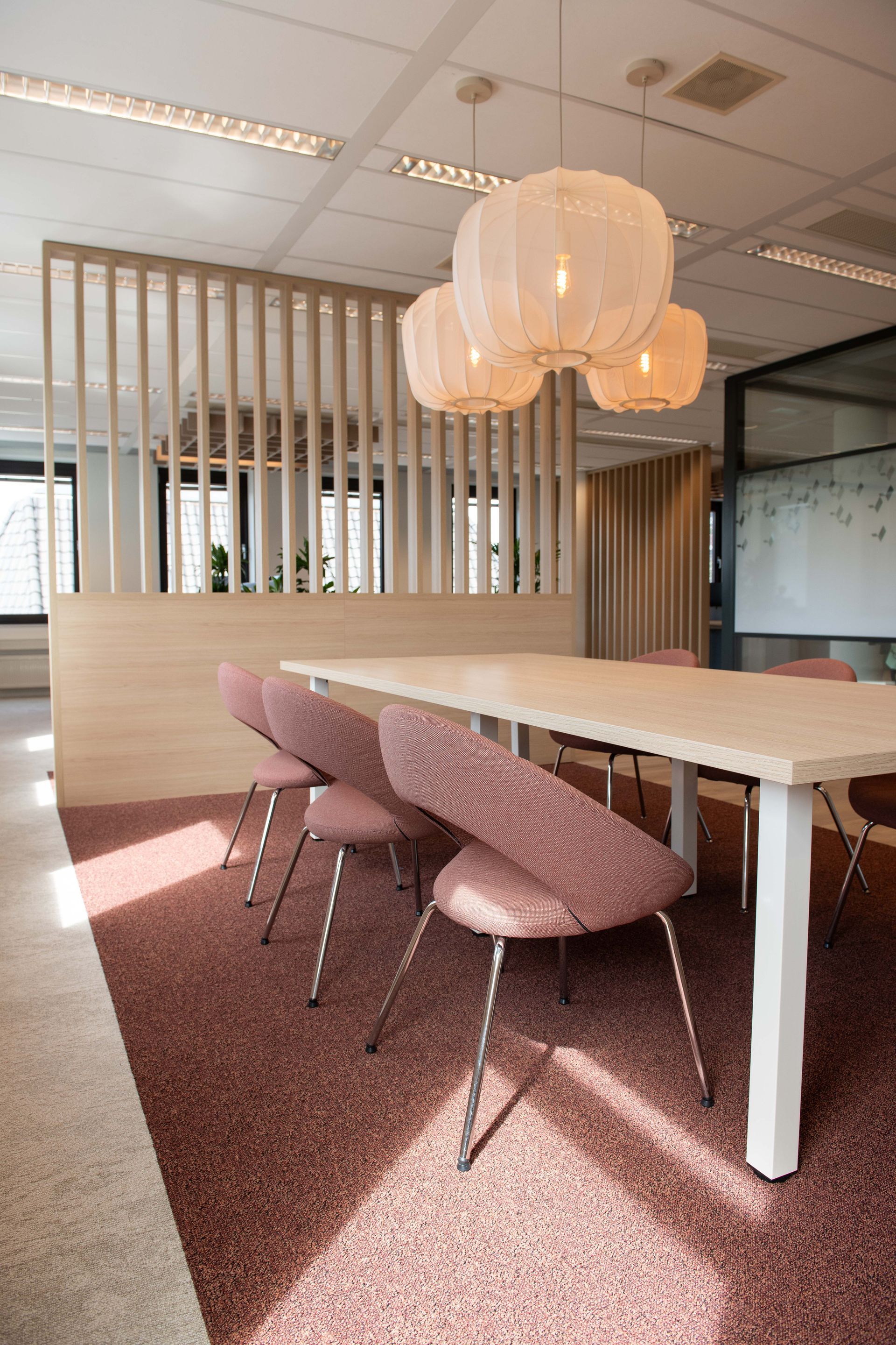 We onderscheidden drie soorten ruimtes: werkruimtes, vergaderruimtes en ontmoetingsruimtes. Voor elk type ontwierpen we drie verschillende moodboards waarop het volledige personeelsbestand kon stemmen. 76 mensen reageerden, waardoor iedereen betrokken was bij de keuzes en het gevoel van eigenaarschap kreeg.