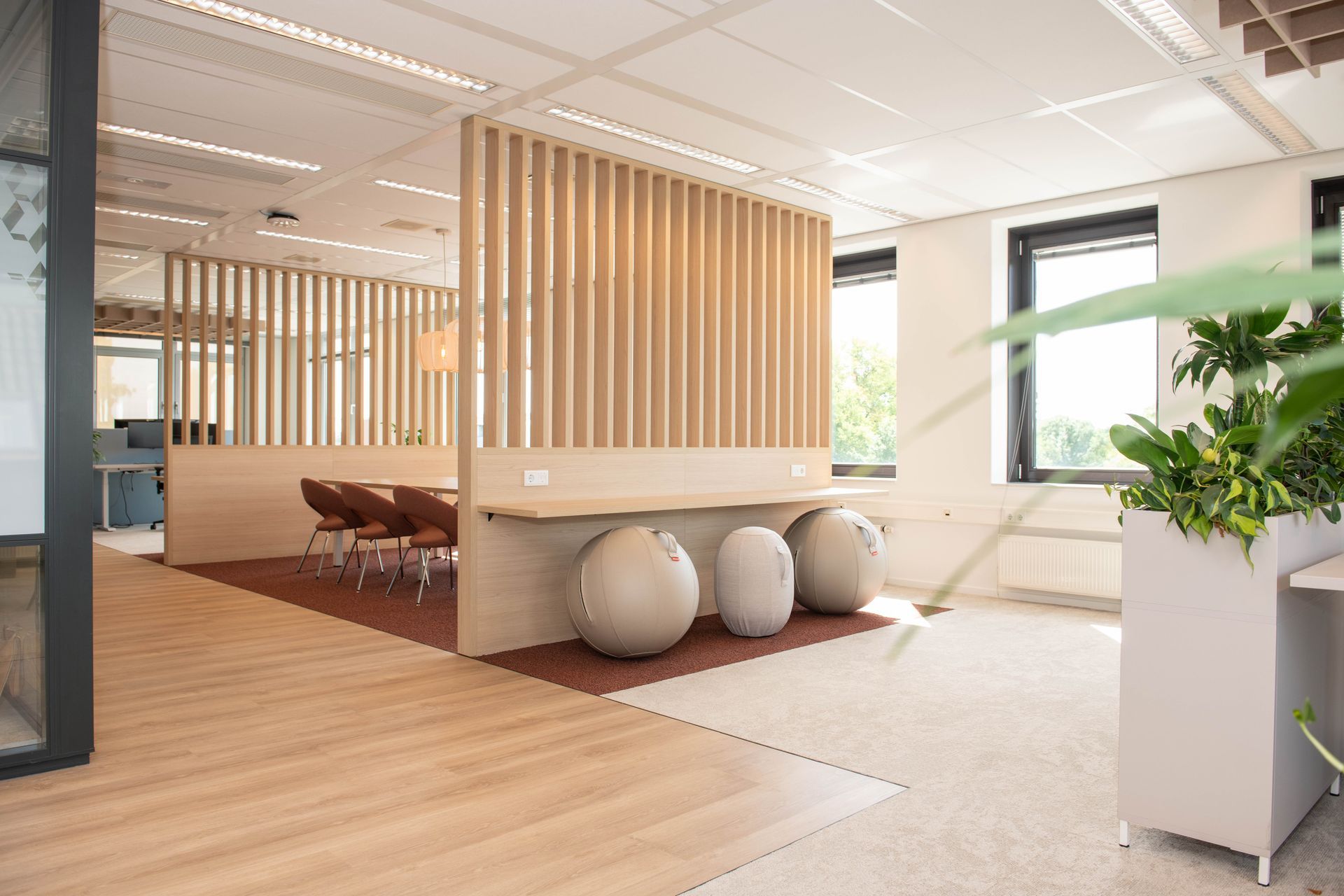 Ergonomisch meubilair zoals hoog-laag bureaus, goede stoelen en zitballen werden toegevoegd. Geluidsexperts onderzochten de akoestiek, waarna we geluidslekken opvingen met PET-vilt materialen.
